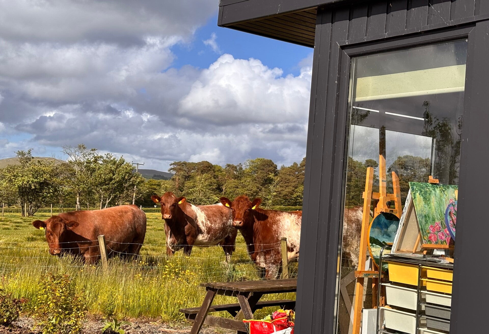 I was gardening around my studio, pulling weeds and planting a few flowers, when my cows wandered over to see what I was up to. They stood at the edge of the garden, curious and calm, watching me work as if they were trying to understand the task. It was a peaceful moment, with the soft rustle of leaves and the gentle presence of my cows nearby.